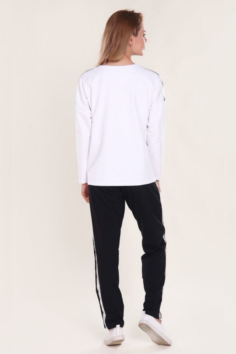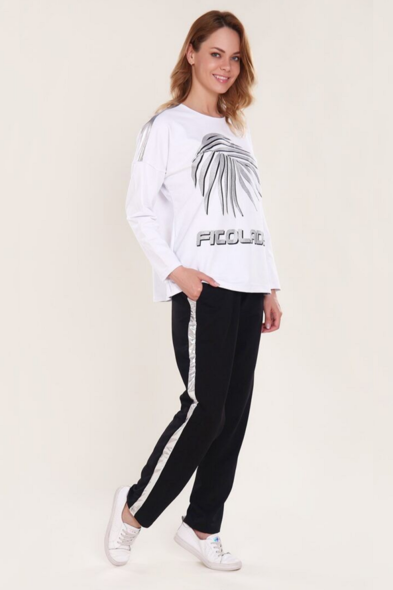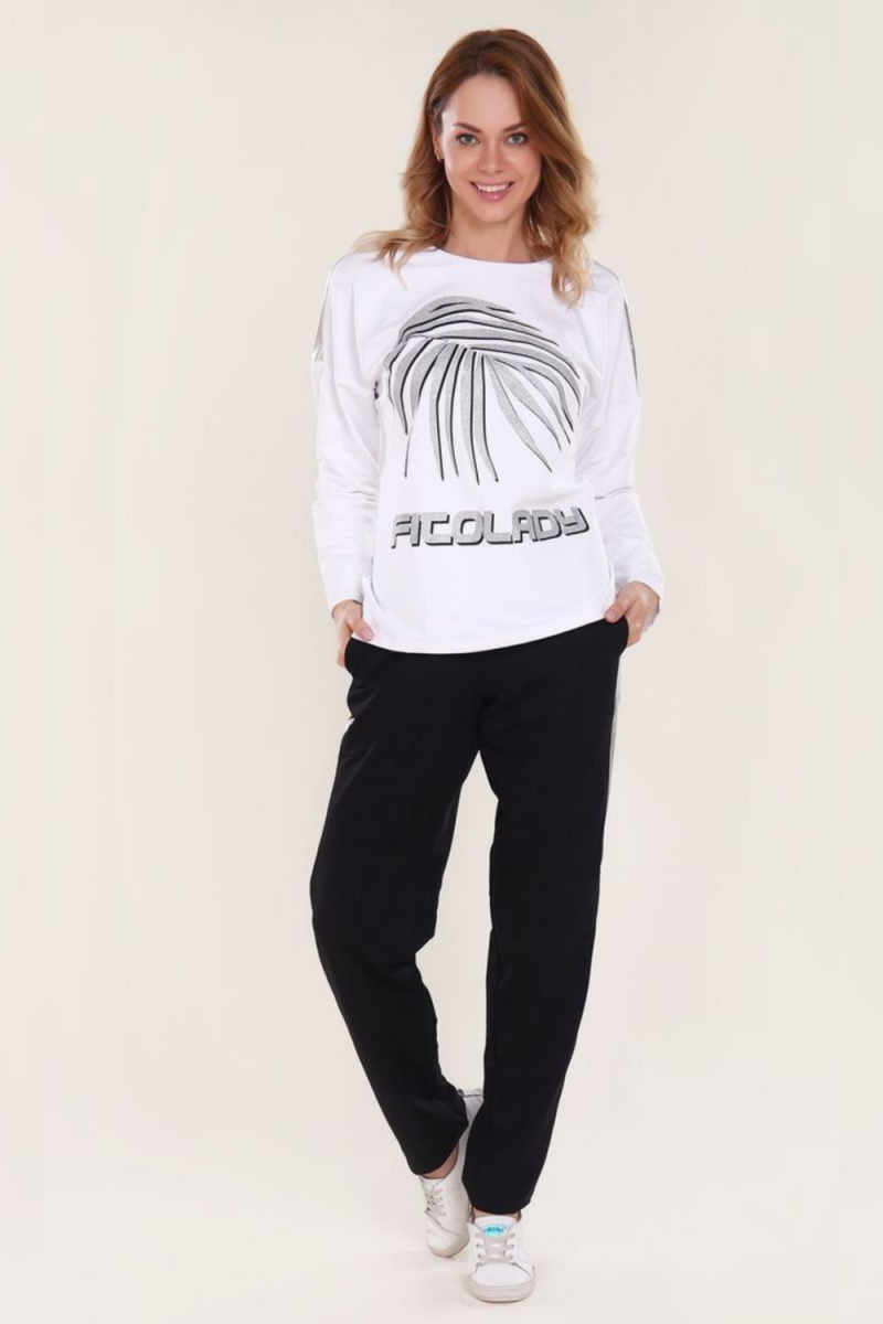 Комплект включает уютный джемпер с заниженной линией плеча, украшенный изящным растительным принтом, и удобные брюки с поясом на резинке и боковыми карманами, дополненные стильными боковыми полосками. Свободный крой подходит для любого типа фигуры и отлично подходит для спорта, отдыха или повседневной носки.